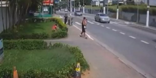 Nesse momento, outro homem que estava na esquina observando a cena corre e começa a segurar o suspeito. A babá se levanta e consegue resgatar a criança.
