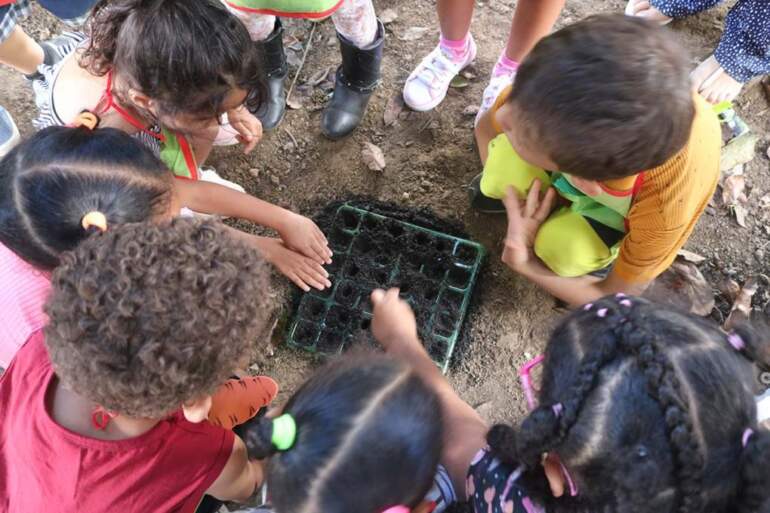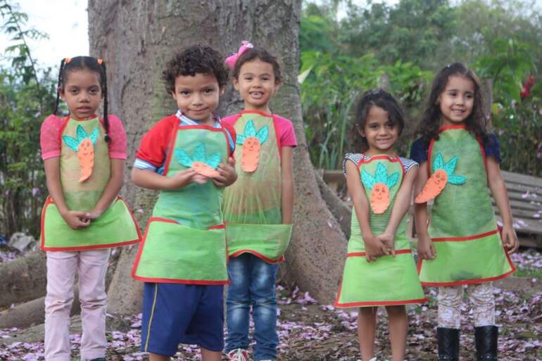 Alunos da educação infantil participam de aula de campo na horta do Vila América