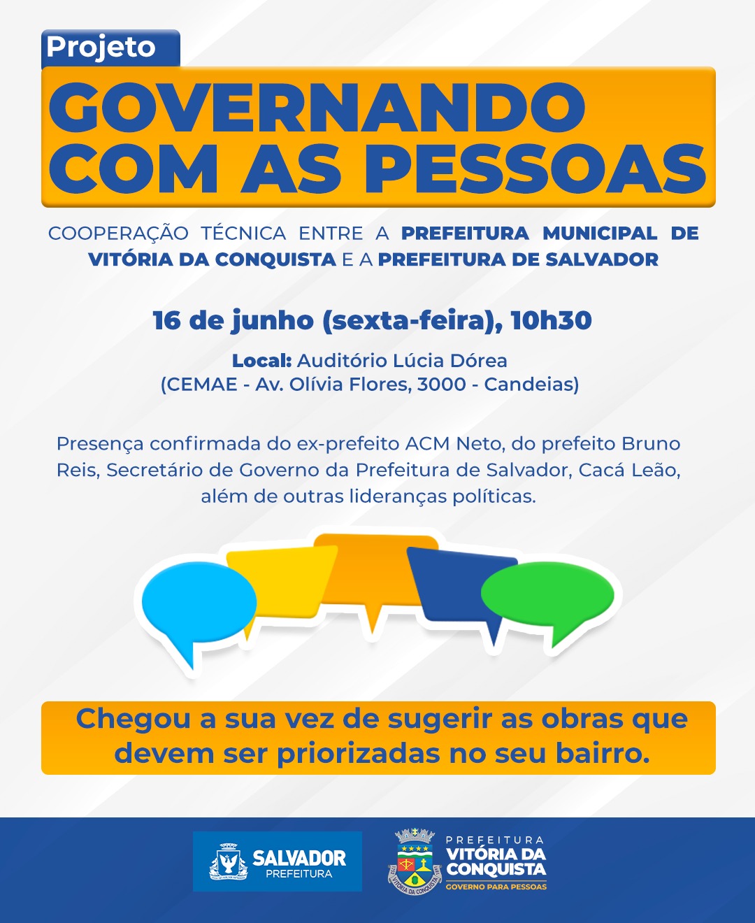 O projeto Governando com as Pessoas tem o objetivo de desenvolver mecanismos de participação popular efetiva através de consultas realizadas nos bairros de Vitória da Conquista. A ideia é inspirada no programa “Ouvindo Nosso Bairro”, desenvolvido pela Prefeitura de Salvador.