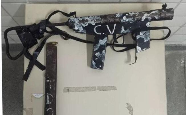 No local da troca de tiros, a polícia apreendeu uma submetralhadora calibre 9mm, que ostentava a sigla de uma organização criminosa, além de um carregador e munições.