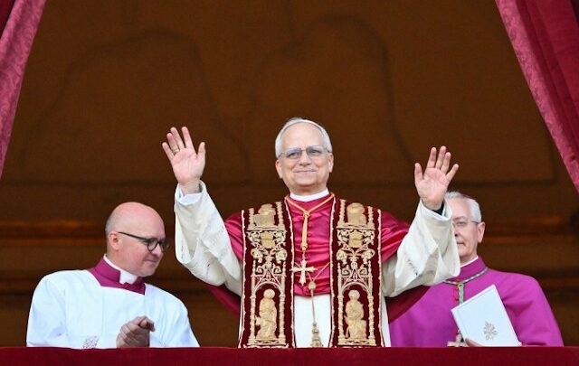 O recém-eleito papa Leão XIV, Robert Francis Prevost, aparece pela primeira vez na sacada central da Basílica de São Pedro, no Vaticano