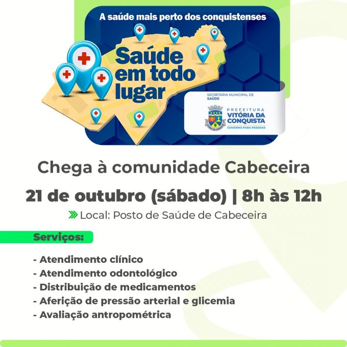A ação será de 8h às 12h, no posto de saúde satélite de Cabeceira, e ofertará atendimento médico clínico e odontológico, aferição de pressão arterial e glicemia, avaliação antropométrica e distribuição de medicamentos. Toda a comunidade do entorno é convidada a participar.