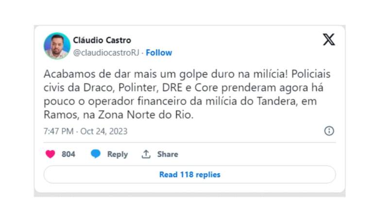 A Polícia Civil do Rio de Janeiro deteve André Felipe Mendes, primo e operador financeiro de Danilo Tandera, um dos milicianos mais procurados do estado, que opera em Ramos, na zona norte da cidade. A notícia foi anunciada pelo governador Cláudio Castro (PL) em suas redes sociais. De acordo com a publicação, essa prisão representa um “duro golpe na milícia”. André já estava sob investigação, e contra ele havia um mandado de prisão pendente. Mais cedo, Castro informou que um plano de contingência foi ativado no estado para garantir a segurança da população, que ficou amedrontado com os ataques ocorridos na última segunda-feira (23).