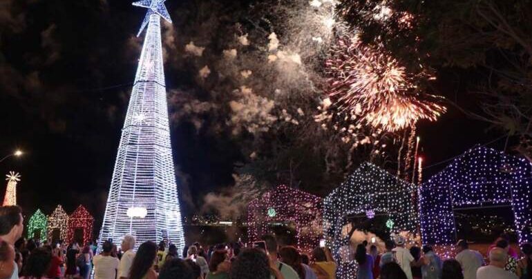 A Prefeitura de Vitória da Conquista inaugurou oficialmente, neste domingo (10), a ornamentação natalina do Parque Ambiental da Lagoa das Bateias. Ao entardecer, após uma rápida contagem regressiva, a prefeita Sheila Lemos acionou o controle remoto e as luzes foram finalmente acesas, sob o som dos fogos de artifício instalados num barco, bem no centro do espelho d’água.