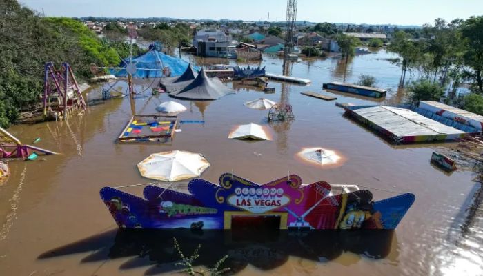 O parque, que também abrigava um circo, foi praticamente engolido pela enchente, restando apenas a cobertura emergindo das águas. Nas imagens, os guichês das bilheterias estão quase totalmente submersos, testemunhando a força avassaladora das águas que inundaram o local.