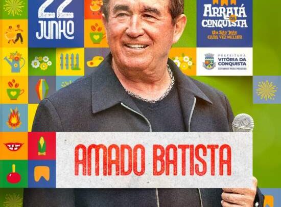 O cantor mais amado do Brasil retorna a Vitória da Conquista para subir ao palco do Arraiá da Conquista e encerrar o último dia de festa por volta de 1h, no Centro Cultural Glauber Rocha. Neste ano, o artista comemora 49 anos de uma trajetória marcada por números impressionantes: mais de 38 milhões de discos vendidos e mais de três bilhões de visualizações em plataformas digitais. O artista já recebeu centenas de prêmios, incluindo 28 discos de ouro, 28 de platina e um de diamante, consolidando-se como um dos músicos de maior sucesso na história da música popular brasileira. Em meados dos anos 1970, Amado Batista inovou ao combinar modas de viola com o estilo da Jovem Guarda, incorporando referências que vão de Elvis Presley aos Beatles. Em quase cinco décadas de carreira, lançou inúmeros sucessos, entre eles, Grande Cantor (1985), Seresteiro da Noite (1985) e Meu ex-amor (1989).