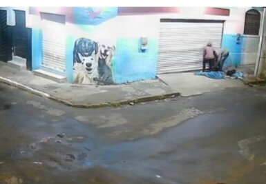 Como é possível ver no vídeo, duas pessoas agem forçando as portas do estabelecimento e, ao menor sinal de algum veículo se aproximando, jogam um cobertor no chão e fingem que estão dormindo.