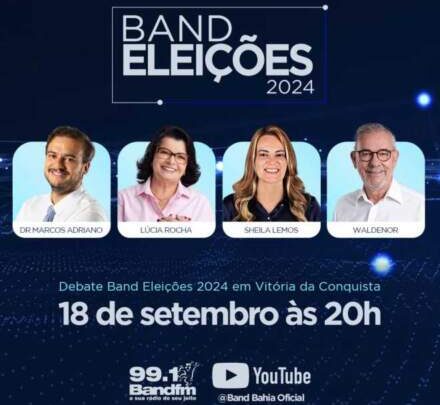 Os quatro candidatos à Prefeitura Municipal de Vitória da Conquista foram convidados para o primeiro debate eleitoral promovido pela Band Bahia, que será realizado nesta quarta-feira (18), às 20h. O evento, aguardado com grande expectativa, será transmitido ao vivo pela rádio Band FM (99,1) e pelo canal do YouTube Band Bahia Oficial. O palco para o confronto de ideias será o Colégio Sacramentinas, localizado na Avenida Jorge Teixeira, no bairro Candeias.