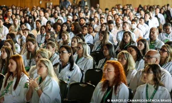 Novos médicos durante anuncio do ministro da Saúde, Alexandre Padilha (Fora de quadro), sobre a expansão do programa mais médicos com a oferta de novas vagas no primeiro edital de 2025.