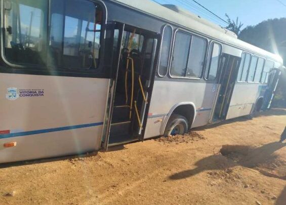Na manhã desta segunda-feira (19), um ônibus de transporte coletivo ficou preso após cair em um buraco no bairro Cidade Modelo, em Vitória da Conquista. O incidente ocorreu em uma rua que não é asfaltada.
