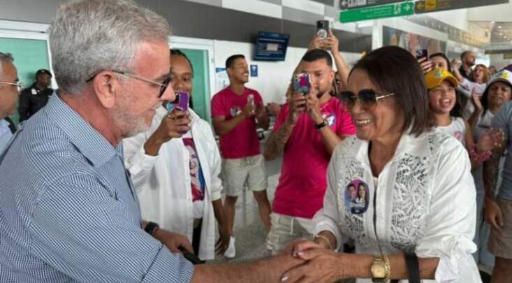 Sheila Lemos (União Brasil) e o deputado federal Waldenor Pereira (PT) chegaram juntos no mesmo voo vindo de Salvador a Vitória da Conquista no início da tarde desta quarta-feira, 20. A prefeita reeleita foi recebida com festa por seus apoiadores no Aeroporto Glauber Rocha, enquanto Waldenor, adversário político, transitava entre o grupo que celebrava sua chegada.