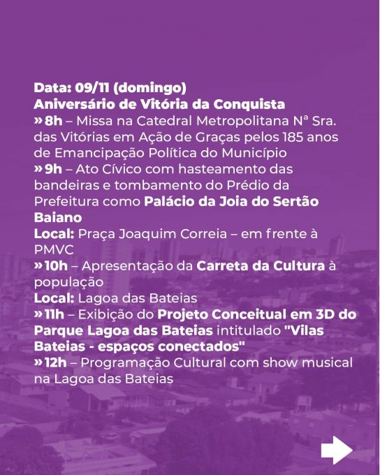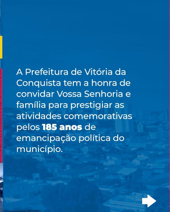 Segundo a prefeita Sheila Lemos, Vitória da Conquista é a melhor cidade para se viver na Bahia, uma cidade segura, desenvolvida e de povo ordeiro que orgulha conquistenses e conquistados. “Somos não apenas orgulho para a Bahia, somos orgulho para todo o Brasil, e de um modo geral temos muitos motivos para celebrar o aniversário da nossa Joia do Sertão Baiano”.