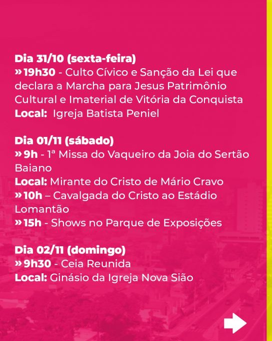 Novembro é mês de celebração pelos 185 anos de emancipação política de Vitória da Conquista. A data oficial é dia 9, mas as atividades comemorativas começam hoje (31), com o Culto Cívico de Abertura da Semana da Cultura Evangélica, na Igreja Batista Peniel, e seguem neste sábado com a realização da 1ª Missa do Vaqueiro, na área do Cristo de Mário Cravo. Outras ações estão programadas para o mês de aniversário do município.