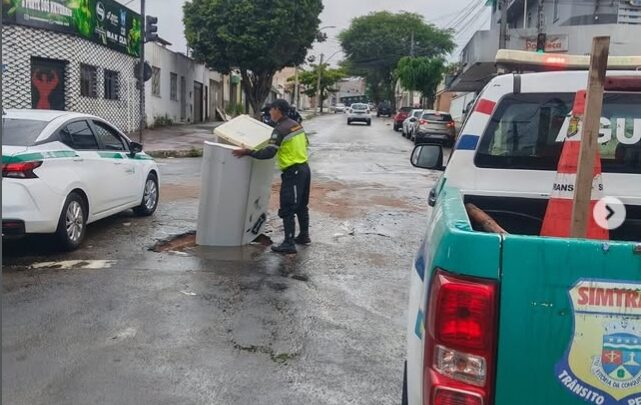Depois da retirada do eletrodoméstico, o Simtrans improvisou uma sinalização no local, instalando alguns dispositivos básicos para alertar motoristas, motociclistas e pedestres sobre o perigo.